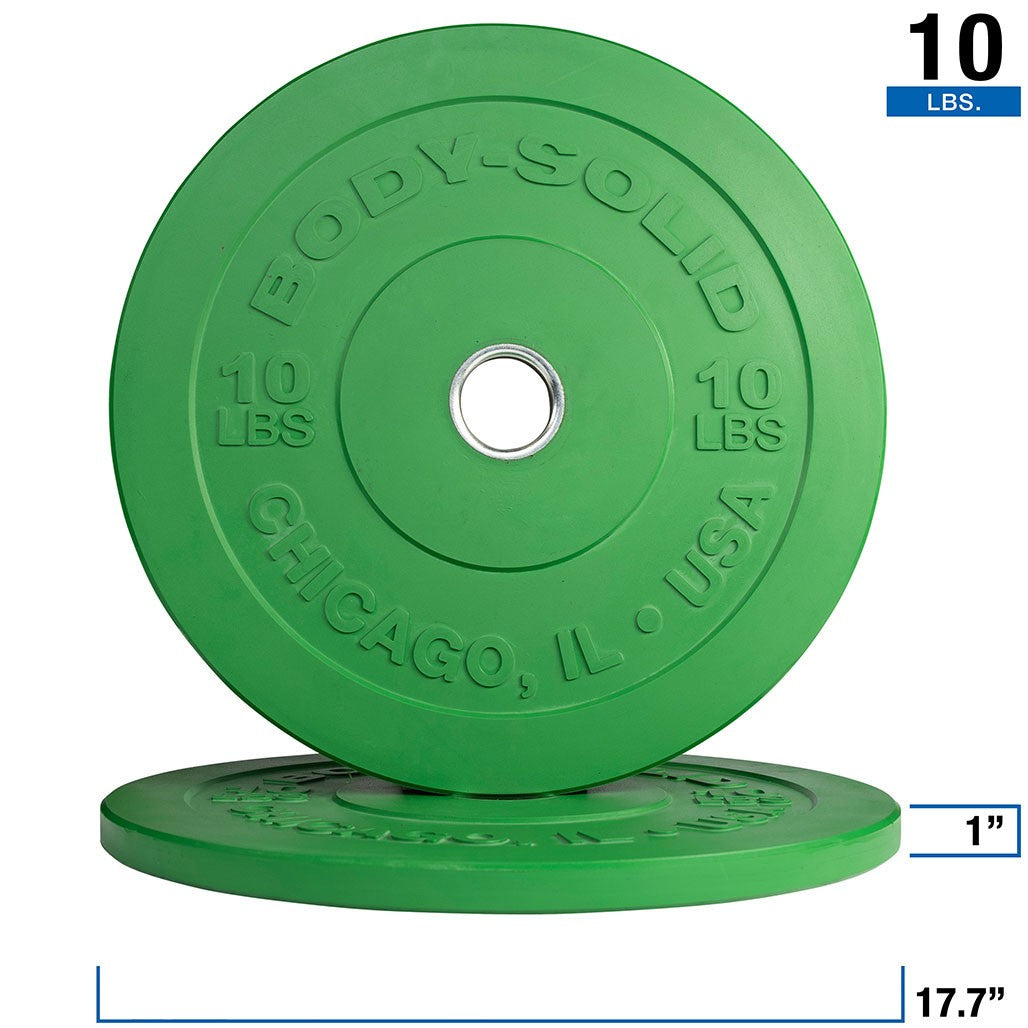 Experience superior durability with the Body-Solid Chicago Extreme Colored Bumper Plates, designed for heavy use and equipped with vibrant colors such as green, black, yellow, blue, and red. Constructed to IWF standards, these bumper plates have a thinner width which allows for loading more weight onto your bar.